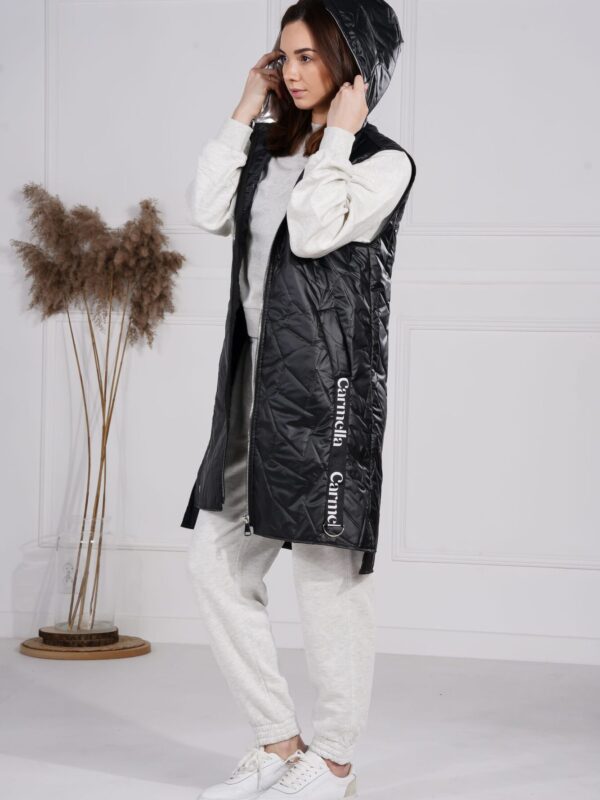 • Długa pikowana kamizelka damska grafitowa z kapturem -PUFF